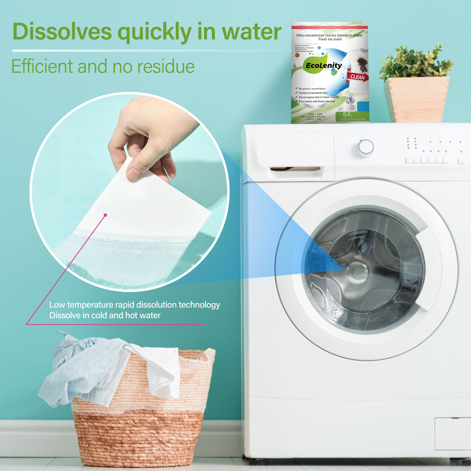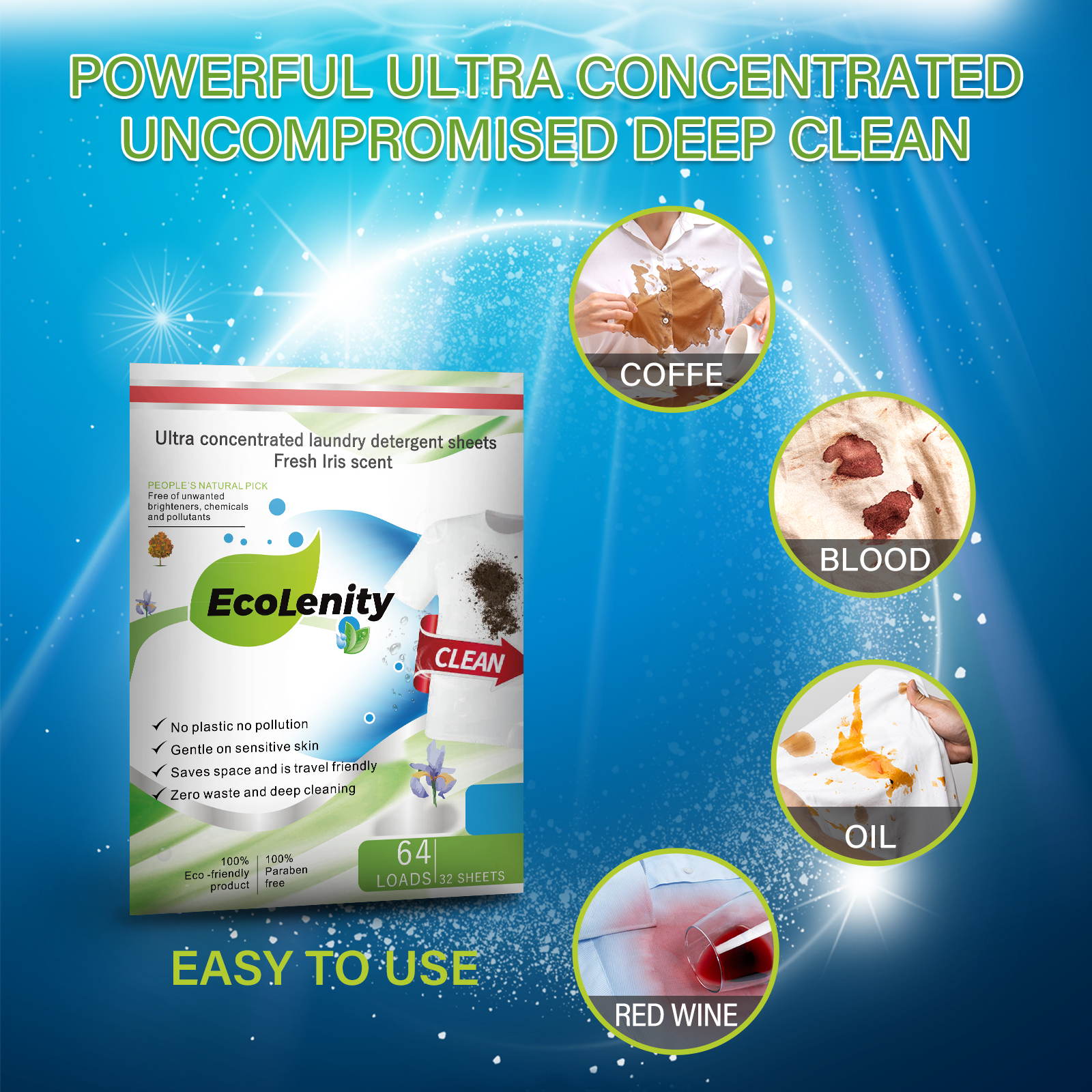 EcoLenity laundry detergent is an ecologically friendly product with the most advanced technology to fight stubborn stains, making fabrics brighter, smelling clean and fresh. It is gentle and safe on clothes and on our hands, working brilliantly to extract the stains from fabric. Our detergent sheets are HE washer-friendly and does not produce loads of suds, which means that you can rinse the clothes quickly without using a lot of water.